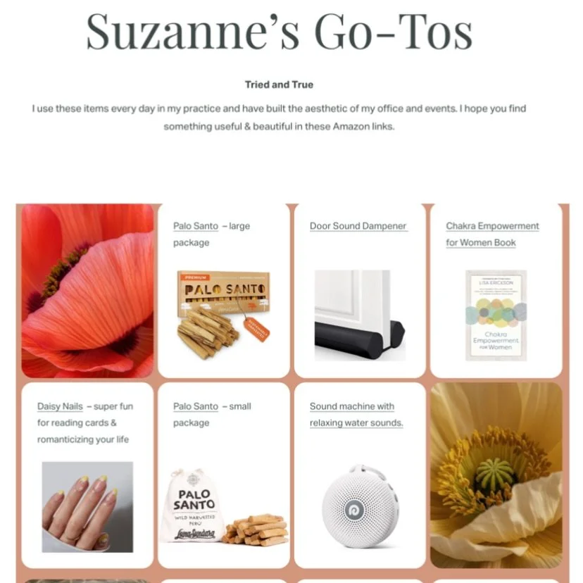 Suzanne has a cozy, sunlit suite in North Richland Hills, TX, and loves to welcome clients into this relaxing space. She also sees clients virtually. She travels throughout DFW for tailored collaborations like private events and corporate wellness offerings.