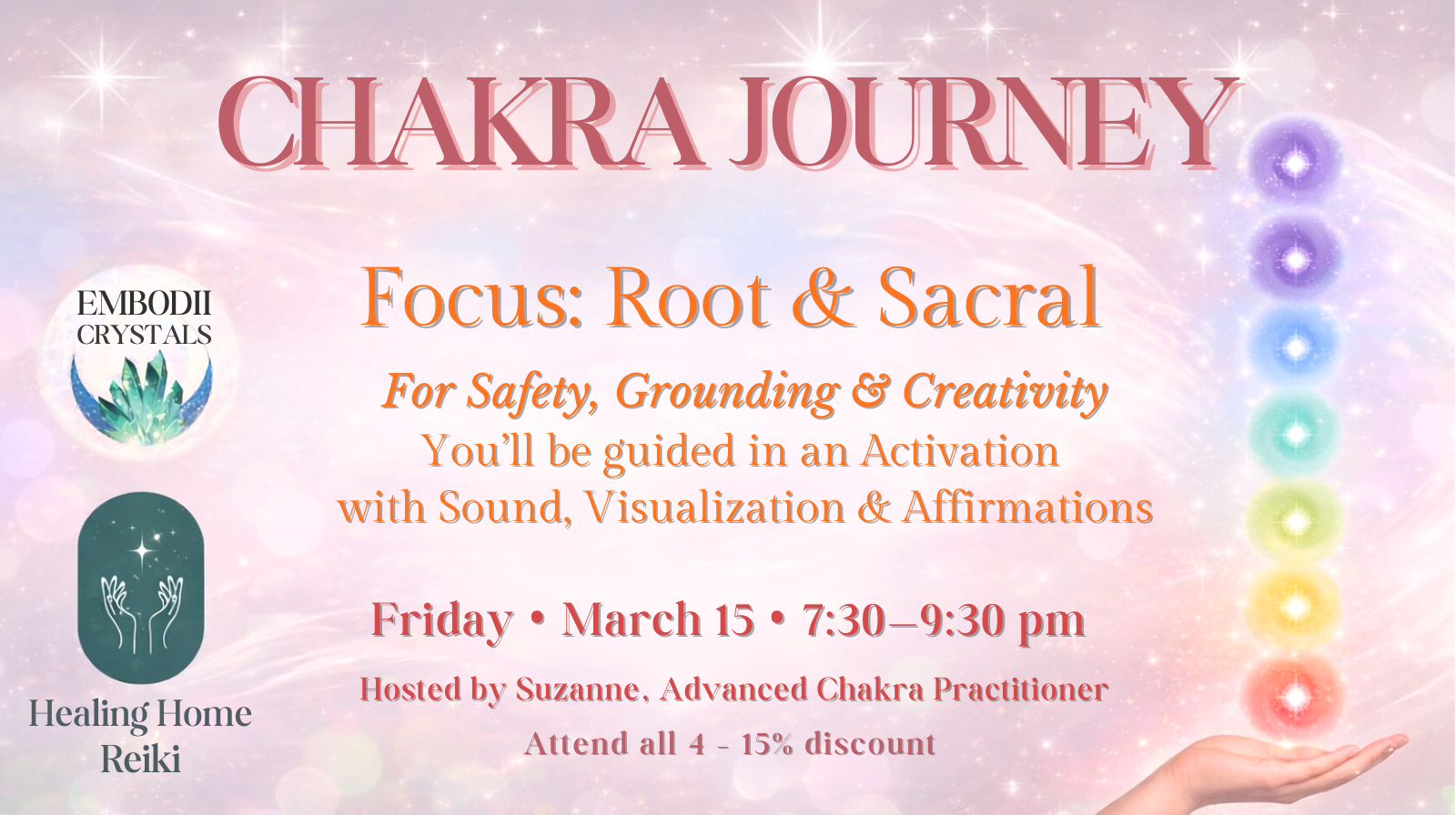 • Week 1 (March 15): The Foundations — Root & Sacral Chakras (Grounding, Security, Inspiration & Creative Flow)