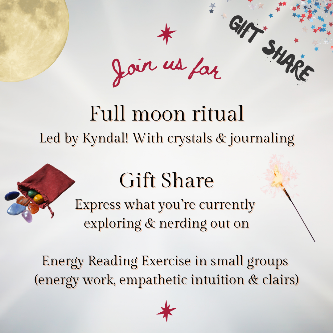 Kyndal of @nappingwitch will lead us in her full moon ritual with crystals and journaling
